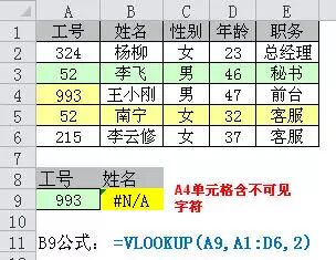 【例7】 如下图所示,由于A列工号含有多余的空格,造成查找错误。
