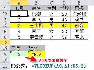 例4:如下图所示根据工号查找姓名,查找出现错误。