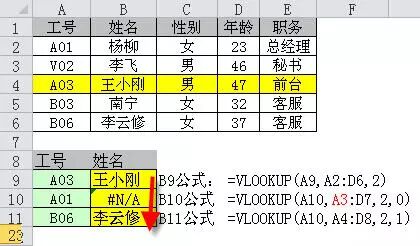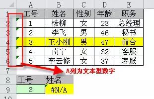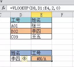 例10 如下图所示的表中,根据姓名查找工号,结果返回了错误。