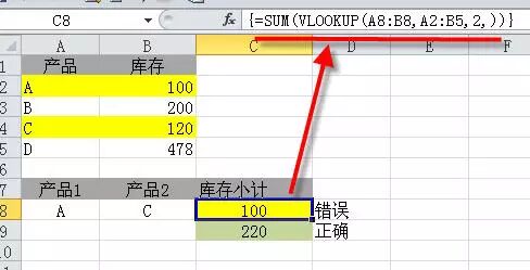 例12:如下图所示,同时查找A和C产品的和,然后用SUM求和。