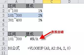 【例11】,如下图所示,根据区间查找提成返回错误值。