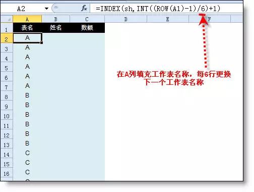 此公式目的是在A列自动填充工作表名称,并每隔N行更换填充下一个名称。公式中6是各表格的现在或将来更新后最大行数,尽量设置的大一些。以免将来增加行汇总表无法更新数据。sh是第1步添加的名称。