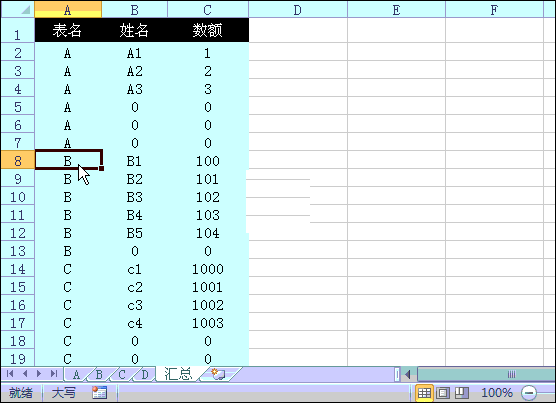 【例】如下图所示工作簿中,A,B,C,D为4个格式相同行数可能不同的表格,需要把这4个表合并到“汇总”表中。