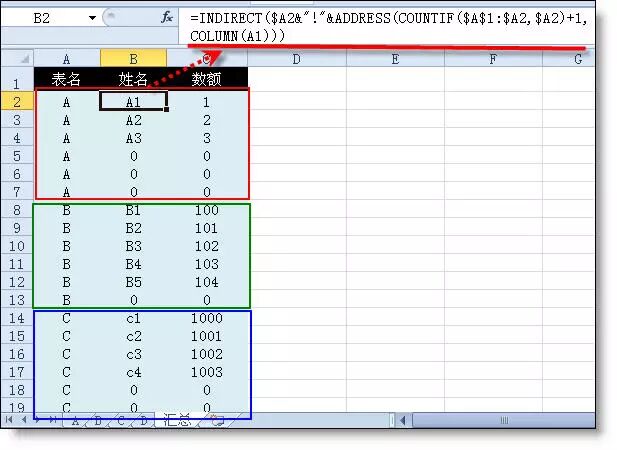 此公式目的是根据A列的表名称,用indirect函数取得该表的值。其中address函数是根据行和列数生成单元格地址,如address(1,1)的结果是$A$1。