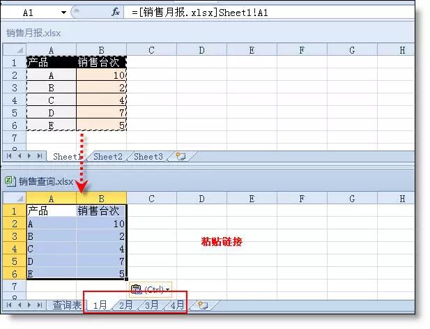 1、在“销售查询”文件中新建各月份工作表,用上面学的粘贴链接的方法,把各月的数据从各文件夹中的销售报表中粘贴过来。