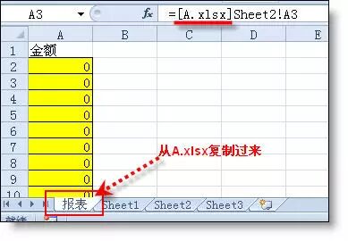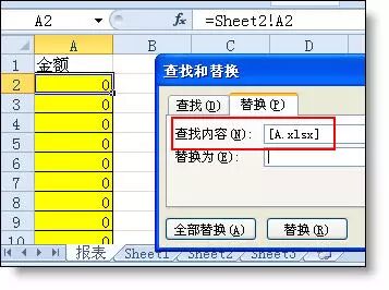 如下图所示,A.xlsx文件的“报表”工作表移动到B.xlsx文件中后,公式并不是引用B文件的sheet2数据,而是A文件中的数据。