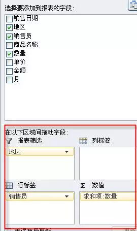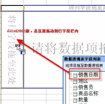 注意:excel2003版和excel2010添加方式不同,是选取字段,直接拖到数据透视表中的相对位置。如下图所示。