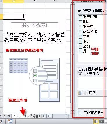 第3步 进行前两步后,会自动新建一个工作表,且在工作表中会有一个数据透视表空白区域,就象盖楼房地基已打好,需要我们安排具体的房间位置。