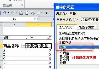 处理方法:把销售员从值框中拖出去(删除),然后双击“数量”列标题,在弹出的“值字段设置”窗口中,把“计数”修改为“求和”,如下图所示。