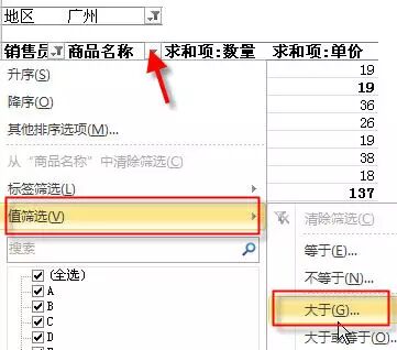 要筛选值,可以借助行标签的筛选值功能。比如筛选数量大于30的行。