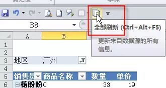 点击“全部刷新”命令可以刷新本工作薄所有数据透视表,如下图所示。