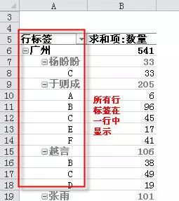 成数据透视表后,如果你是excel2003以上版本,你会看到多列的内容会显在一列中,如下图所示。