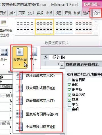 如果你想让列分开,就需要调整数据透视表的报表布局。选取数据透视表 - 在顶部找到“设计”选项卡 - 再打开报表布局下拉菜单,会看到5种不同的布局方式: