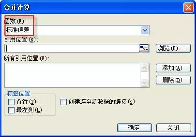 步骤1:选取sheet3表格的A1单元格,excel2003版里,执行数据菜单(excel2010版 数据选项卡) - 合并计算。在打开的窗口里“函数”选“标准偏差”,如下图所示。