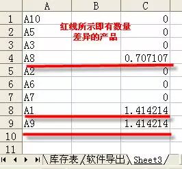 进行以上步骤后,点确定按钮,会发现sheet3中的差异表已生成,C列为0的表示无差异,非0的行即是我们要查找的异差产品。