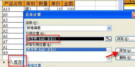 步骤2:接上一步别关窗口,选取库存表的A2:C10(第1列要包括对比的产品,最后一列是要对比的数量),再点“添加”按钮就会把该区域添加到所有引用位置里.