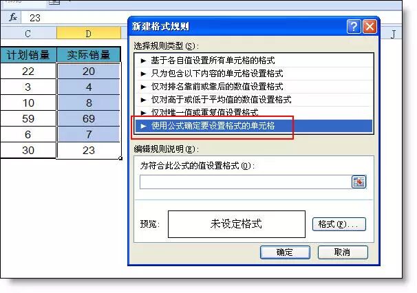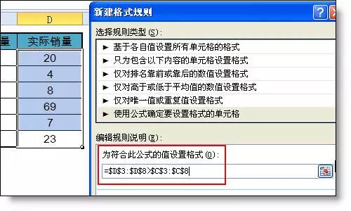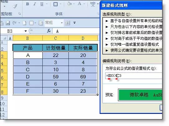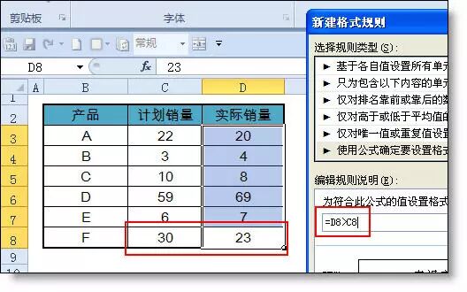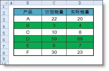 【例1】如下图所示,当D列实际销售>计划销量时,自动填充绿色背景。