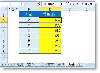 而上述的公式返回的每个表的求和结果,是一组数,最后还需要用sumrpoduct函数进行求和,即:
