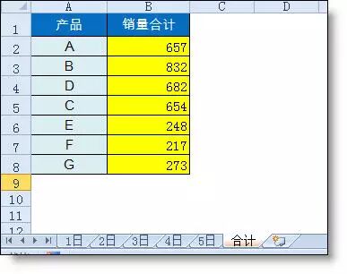 【例】如下图所示,有1日~5日5个列相同、行数不同的明细表,要求汇总出每个产品的销量之和。