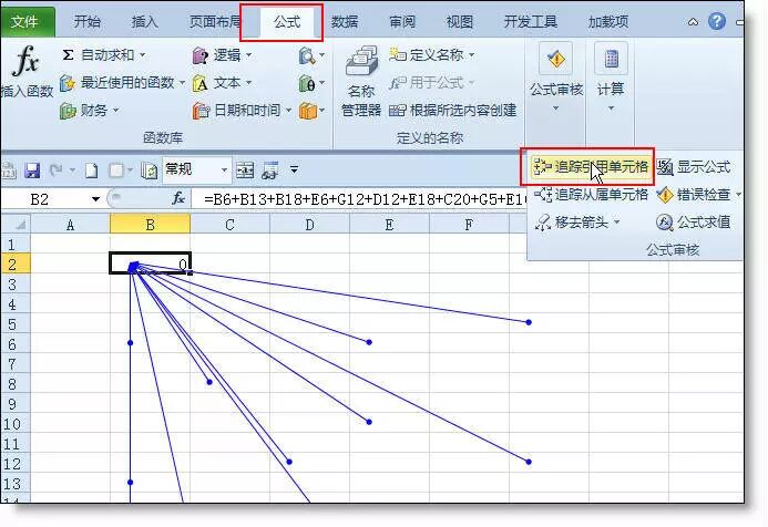 如果一个公式中引用了大量的单元格,而你想看到具体每个被引用单元格位置和值。就点击公式审核中的“追踪引用单元格”命令。