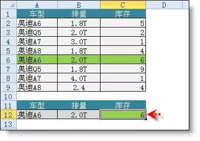 【例】如下图所示,要求在C12单元格,根据A12车型和B12排量,从上表中查找库存数。