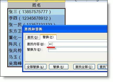 查找 *( ,替换为空,查找)* ,替换为空