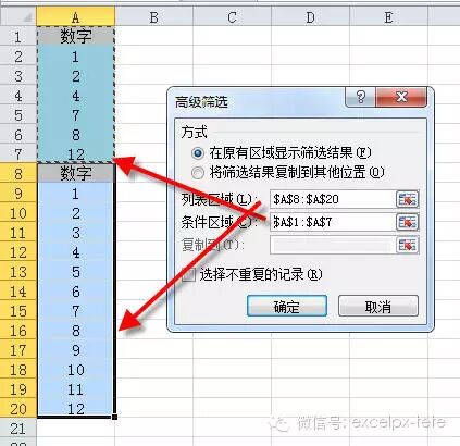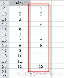 步骤1:在A列下面输入数字1~12,选取1~12区域,数据 - 筛选 - 高级。把上面不连接的区域作为条件区域。