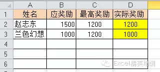 如下图所示的“实际奖励”计算表中,如果“应奖励”数大于“最高奖励”,则按“最高奖励”金额,如果小于则按“应奖励”金额。