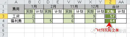 如下图所示,需要对1~12月份的计划和实际数进行求和(为方便截图)